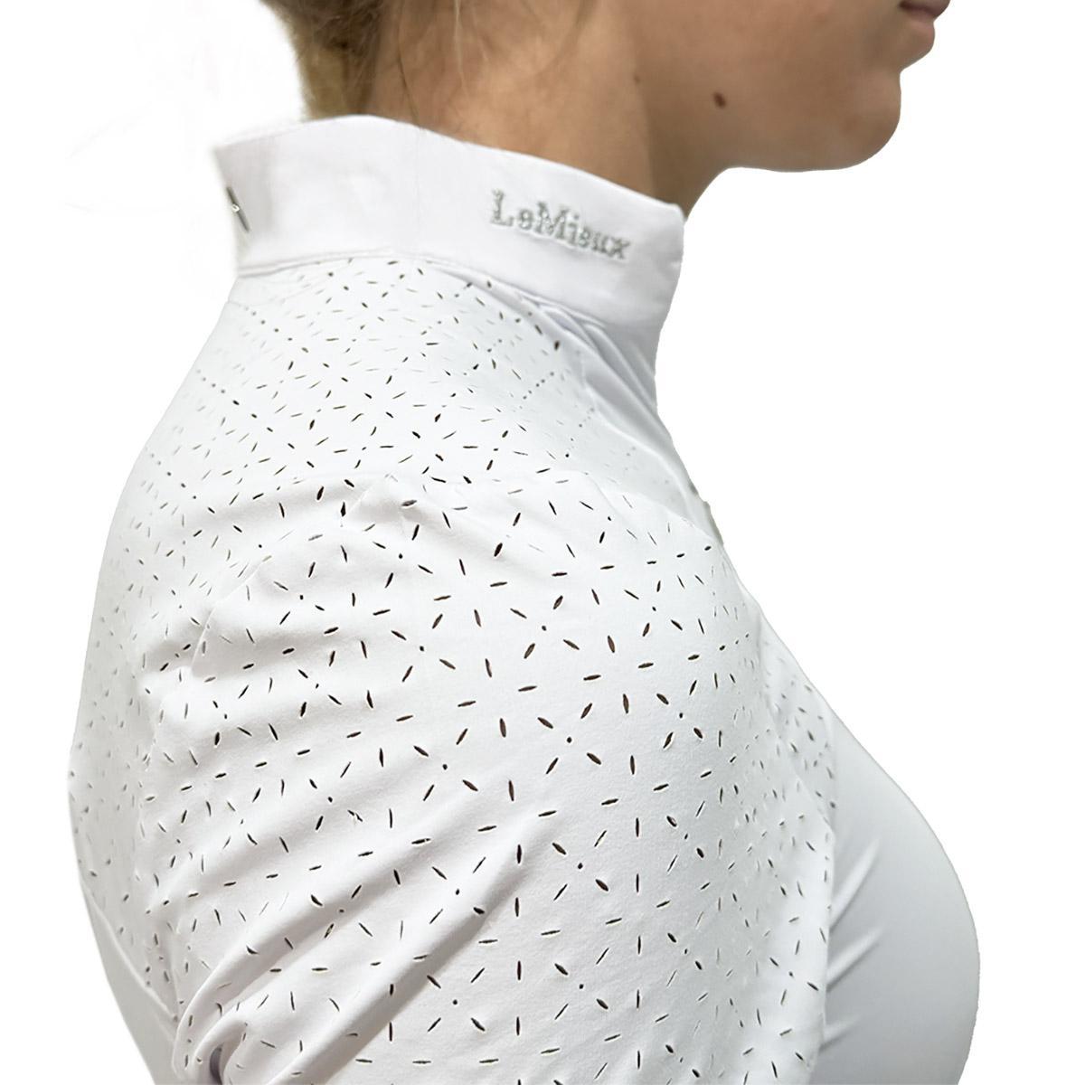 Delicate, laser-cut lace sleeve and back detail provides subtle beauty while also allowing air flow through the shirt to regulate heat and moisture. Finished with a white show collar with LeMieux stud detail.