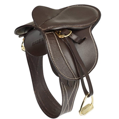 Exquisitely crafted miniature saddle in beautiful fine grain leather. Real design features including a double flap with three girth straps and buckle guards. Comes complete with detachable girth and metal stirrups which make this ideal for learning about parts of the saddle, practicing tacking up and tack cleaning.