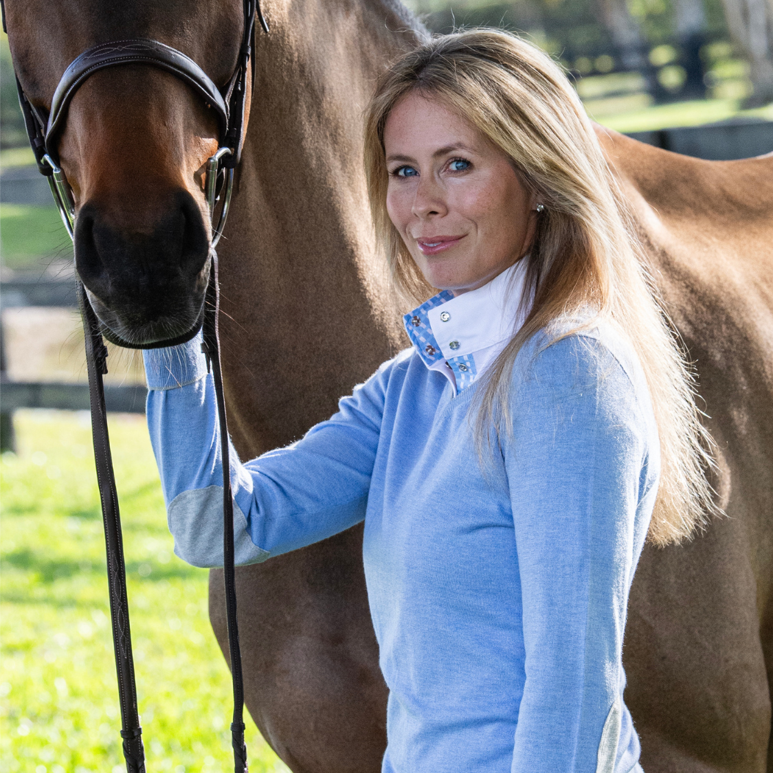 Lightweight and breathable, the Trey V-Neck is expertly knit of extra fine cotton and acrylic yarns with innovative climate control performance for ultimate comfort and easy wash and wear care. Smart equestrian inspired elbow patches and contrast trim provide a fashionable twist.