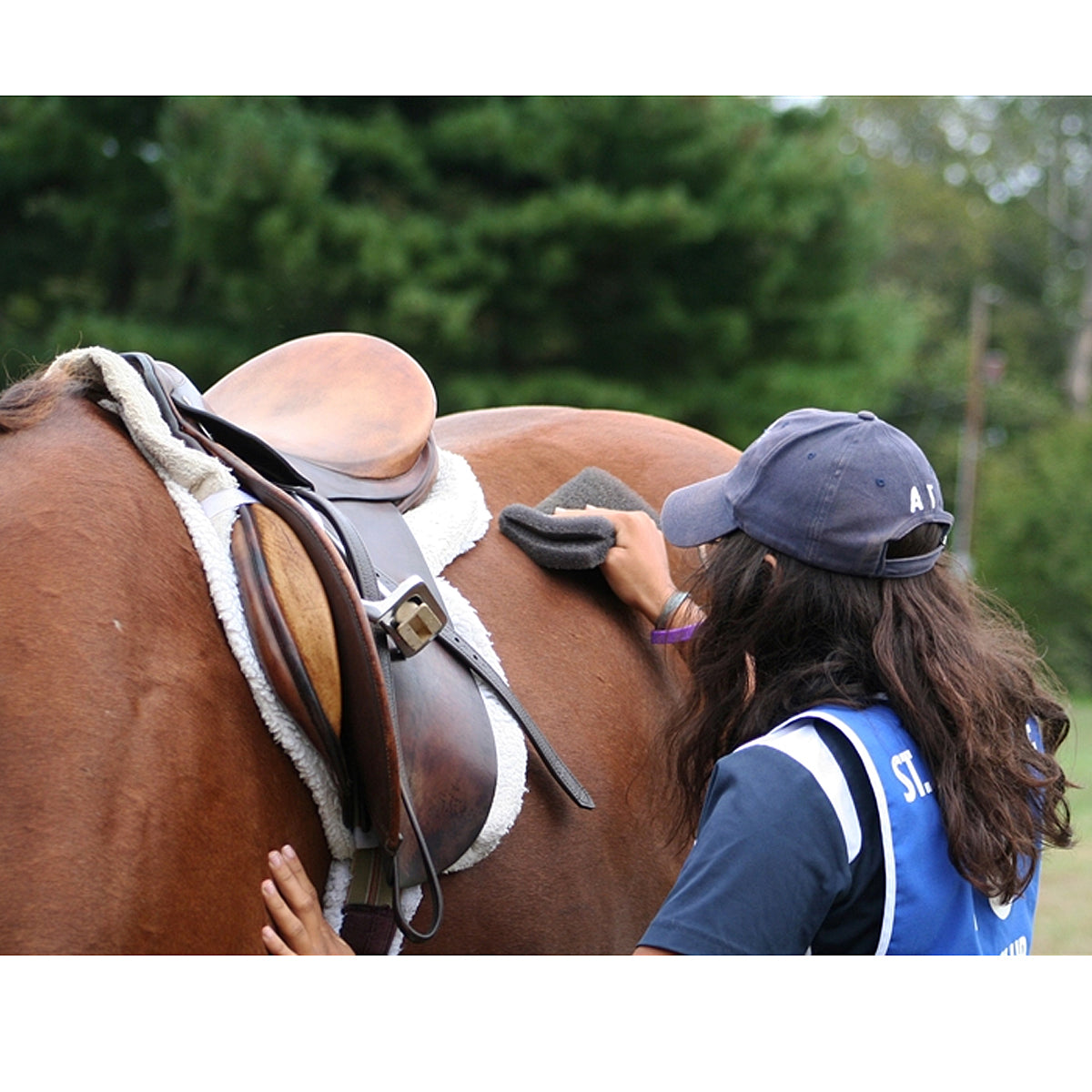 We love this Nunn Finer Scrub Rub, because it combines the best aspects of a sponge, a curry comb and a rub rag all in one. It is the most versatile product and removes anything from sweat marks to dingy deep dirt.