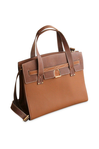 This bag features both pebbled leather and our signature raw leather, our bright gold stirrup clasp, and all the other high-end finishing you expect from an Oakbark & Chrome bag.
