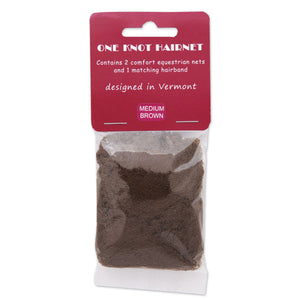 One Knot Hairnet is exclusively designed for equestrians. Finally a rider's hairnet you can put on under your helmet that won't cause such discomfort. Gone is the knot indentation in the center of your forehead! You also get a matching scrunchy so you no longer have to fight to get a hair elastic out of the hairnet