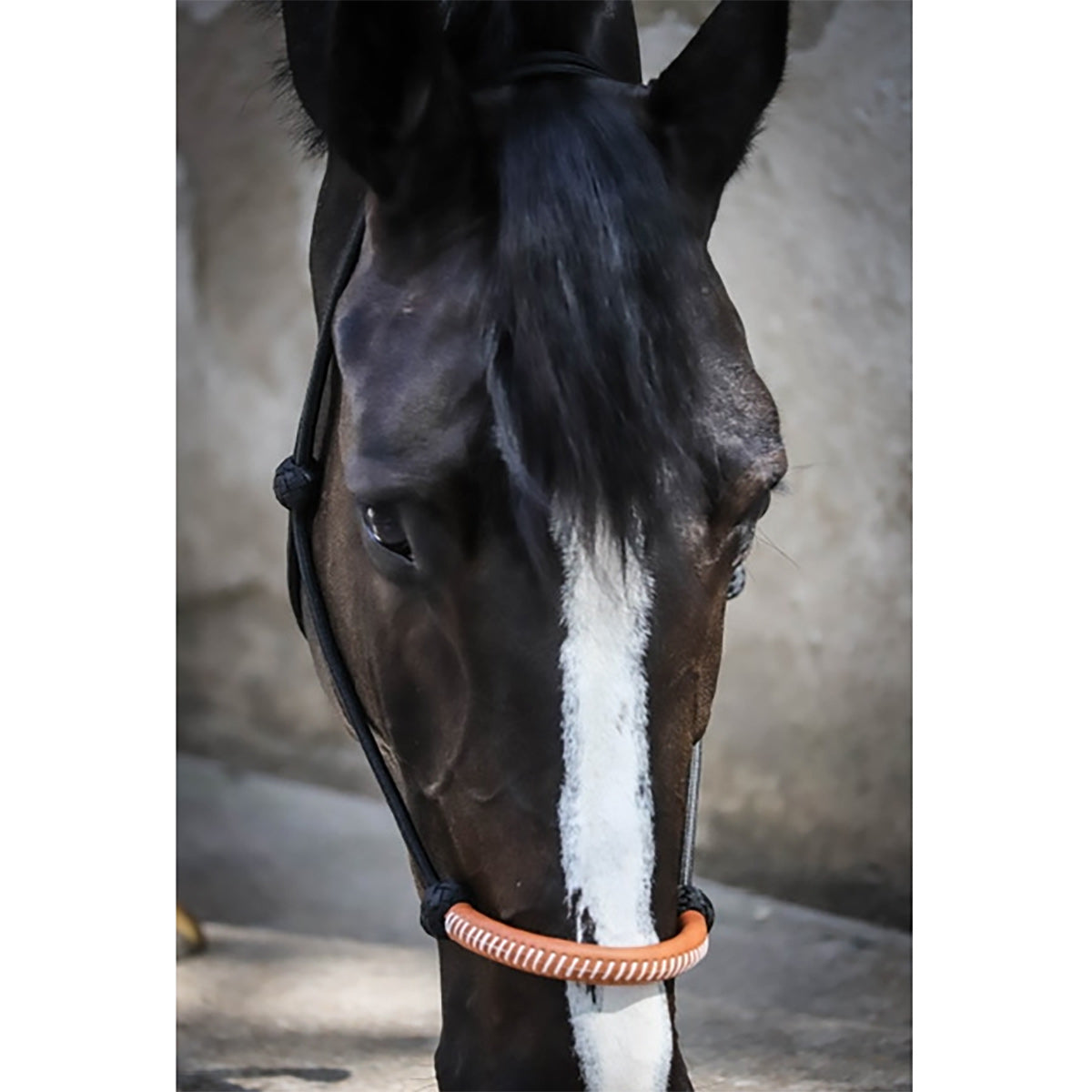 Very similar to its cousin, the rope halter (available here), this is the American rope halter. This halter is made of rope, with a leather reinforcement on the noseband. The reinforcement is sewn with a thick white thread contrasting with the hazelnut leather. Fastens on the left and can be adjusted thanks to a knot. Therefore, it can match any horse size. A lead rope can be used thanks to a ring. This halter can be used for hand walking, but also for lunging.