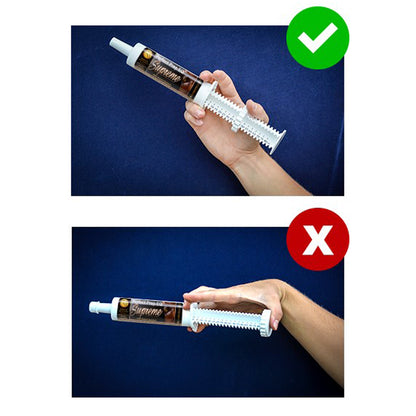 Suggested Use: For maximum effect use 80cc (one full oral syringe) 90 minutes prior to activity. Adjust for desired results. Effects begin 1 hour after administration and can last up to 6 hours. Feed carefully to assure swallowing. Flows best at room temperature.