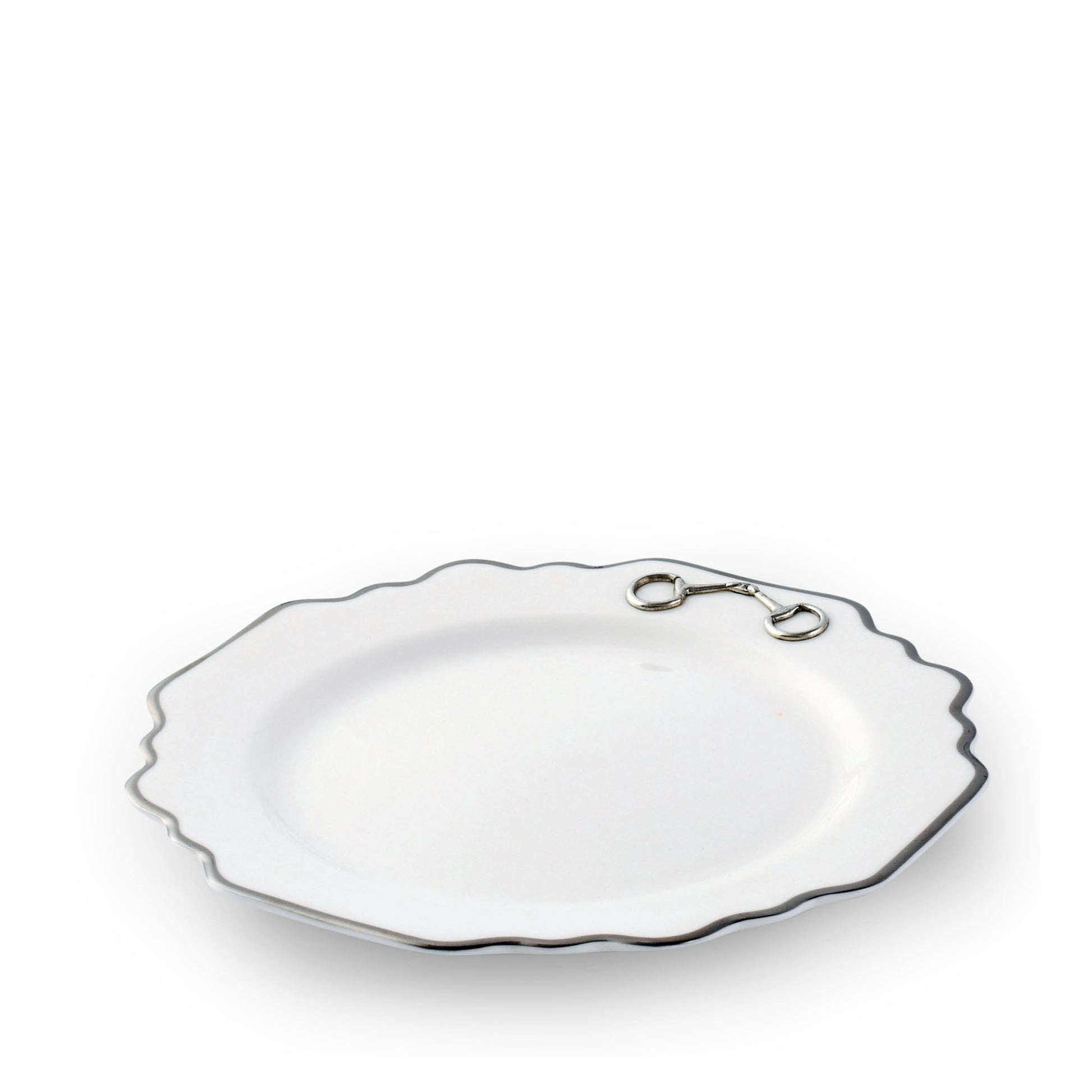 We love this elegant bone china salad plate with scalloped edges and a platinum rim, featuring a charming pewter bit detail. Its versatile design adds a refined equestrian touch to any table setting, perfect for both everyday use and special occasions. Ideal as a gift for horse enthusiasts, it pairs beautifully with other pieces in the collection.