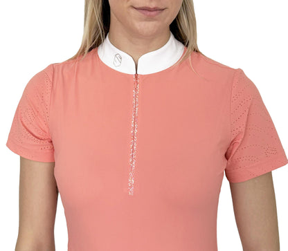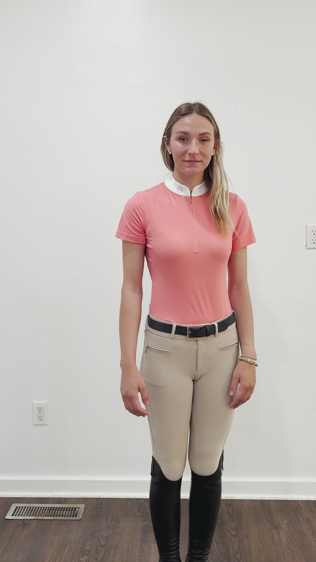 The Aloise Air offers the ultimate in rider comfort and style for the warmer summer months. Premium European fabric aids temperature regulation by wicking sweat away from the body, whilst the custom perforation further enhances breathability. The 'hidden' zipper is framed by tone-on-tone Swarovski Crystal Fabric and a Samshield Swarovski logo highlights the collar. Easy care, machine washable at 30'