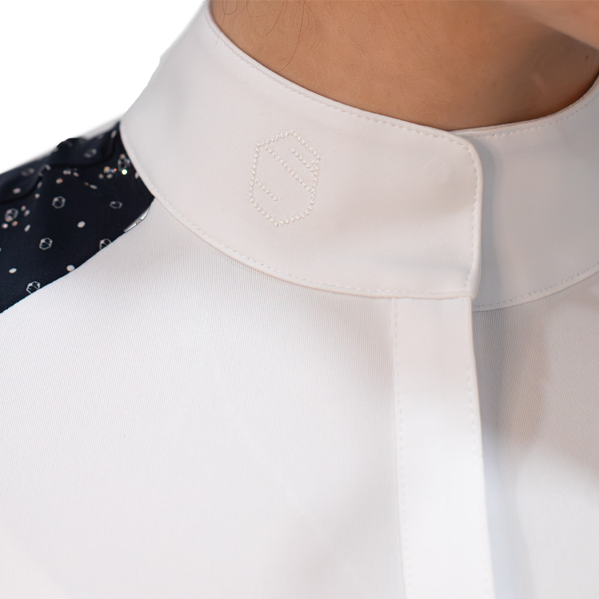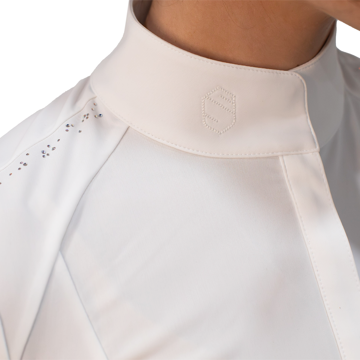 The Gretta Short Sleeve Shirt features a wide, full length bib front with an elegant Swarovski Crystal Fabric panel hiding a half zipper. Elegant, tailored stitch lines give this shirt a sporty, classic feel whilst the premium fabric offers breathability and comfort at all times. Easy care, machine washable at 30'C and made in an eco conscientious manner.