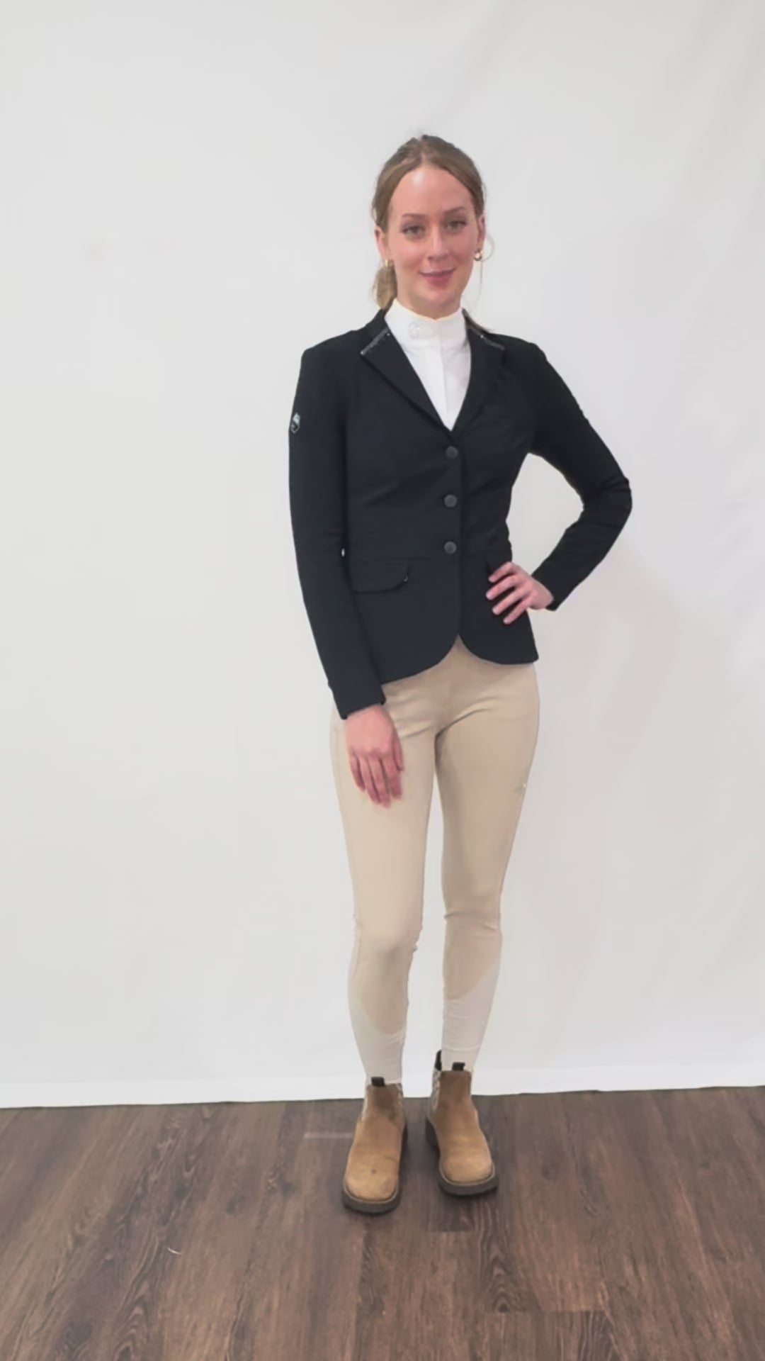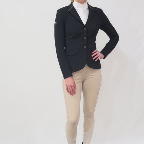 The jacket features a zip closure with a custom slider, as well as a decorative front pocket adorned with Swarovski® crystals and pearls. Its mesh and stretch lining add breathability, while its custom buttons and shorter front design provide extra comfort. The fabric also offers UV protection, wearability resistance, and is wrinkle-free for easy care, making it perfect for machine washing.