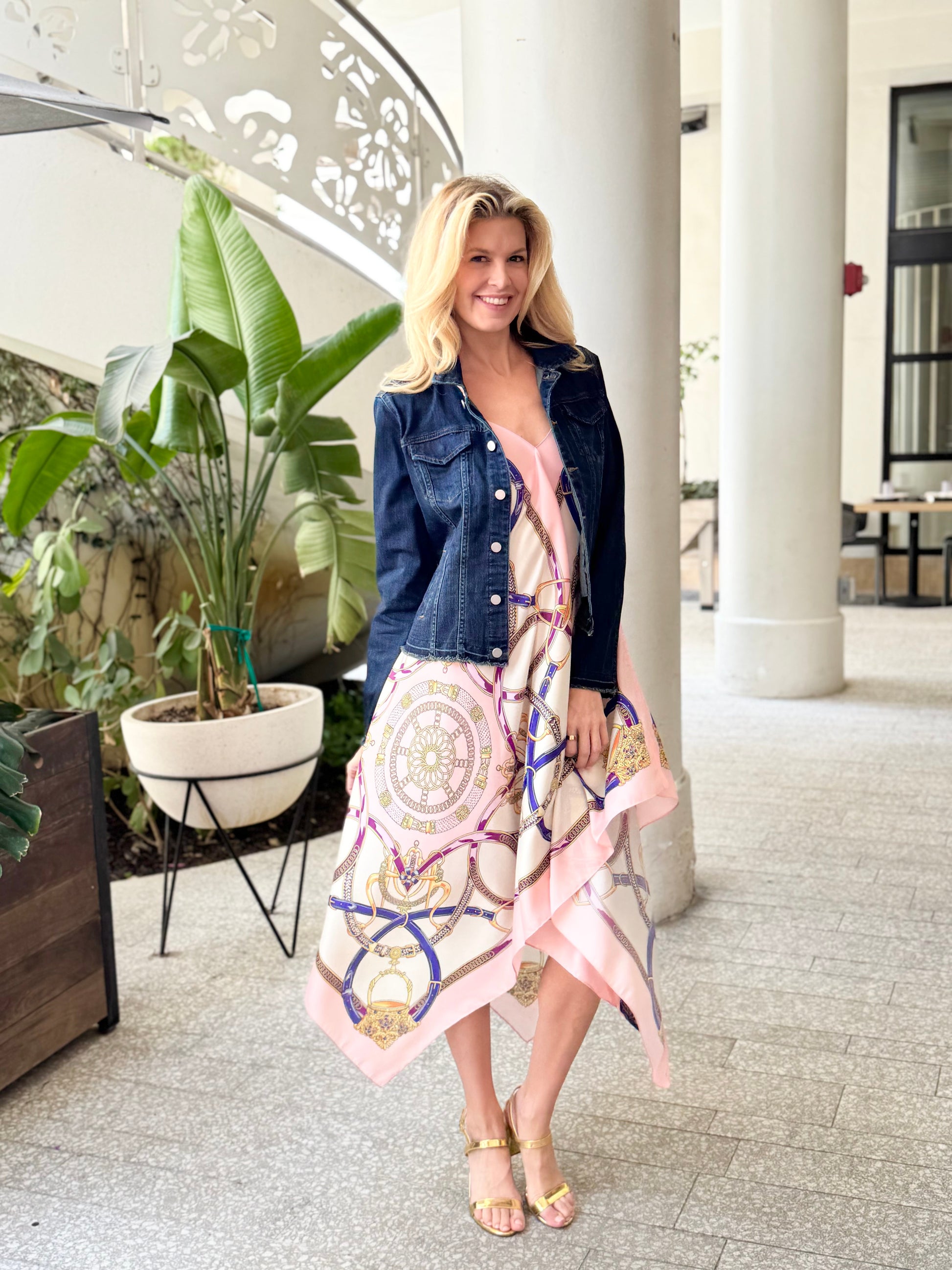 We love this Silk Dress in Purple Stirrup for its perfect blend of comfort and style. Designed with adjustable straps and elastic trim, it offers a flattering fit for most body types. Ideal for tropical and summer weather, this dress keeps you cool while looking effortlessly chic. For a coordinated look, a matching denim jacket is available upon request. Elevate your warm-weather wardrobe with this versatile and elegant piece.