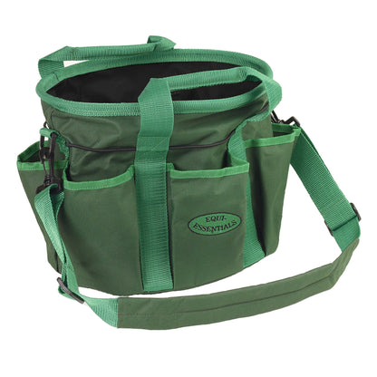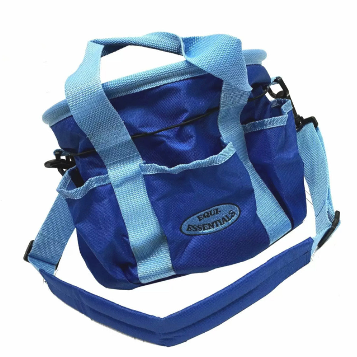 Heavy-duty water-resistant nylon grooming tote keeps all of your grooming products organized, clean, and portable. Features enough outside pockets with secure bungee cord for brushes and other grooming essentials, roomy interior, stiff bottom with feet for stability, nylon drawstring top to keep dirt out, carry handles, and a removable and adjustable shoulder strap.