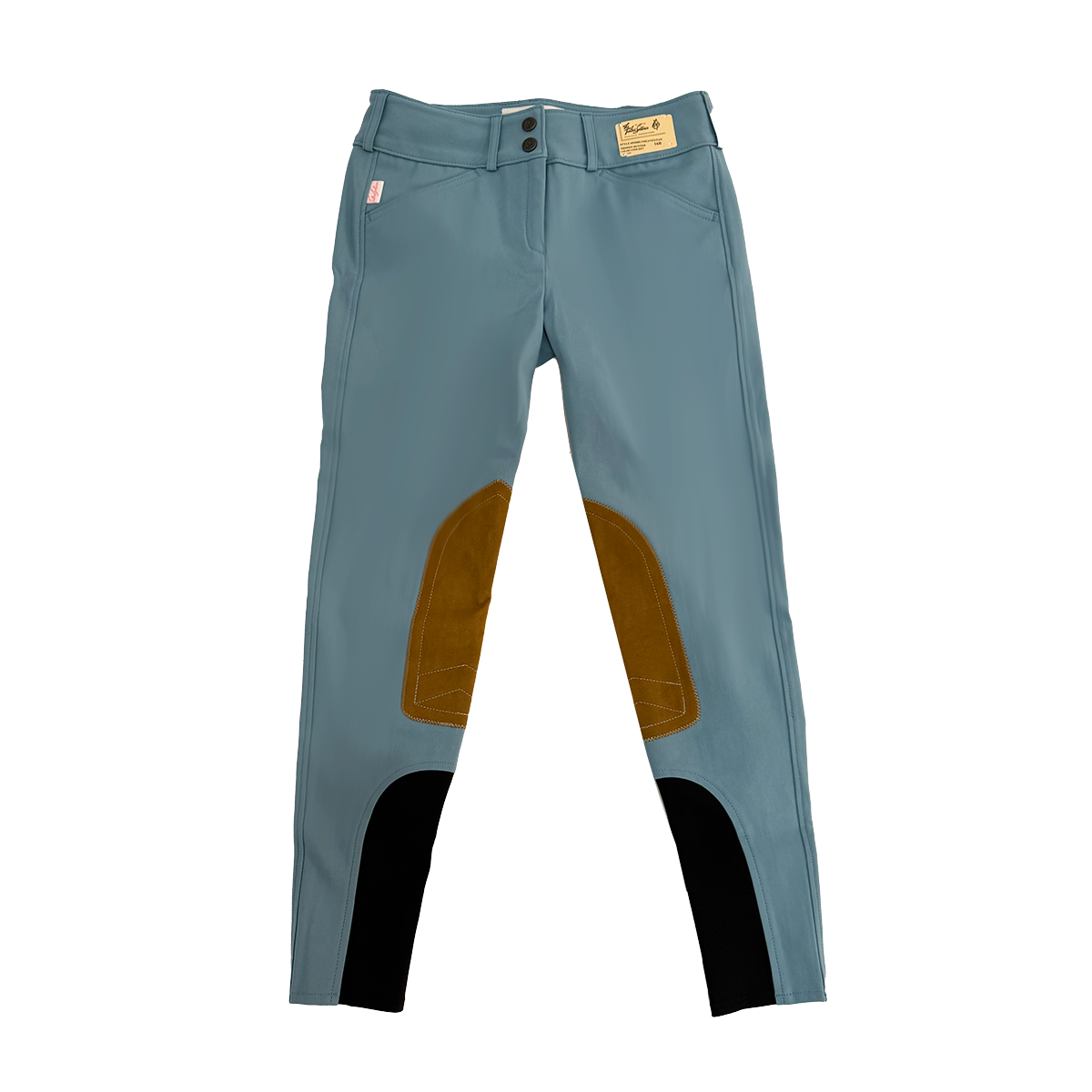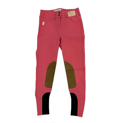 The new fabric allows for a form-fitting figure-flattering look while maintaining its shape and moving with you while riding. These breeches are made from a lightweight, woven 73% cotton/20% polyamide /7% Lycra, with a four-way stretch for comfort. Classic European leg seams on the outside of the breech. Vintage clarino knee patches, front zip, front slash pockets, belt loops, Velcro brand ankle closures.