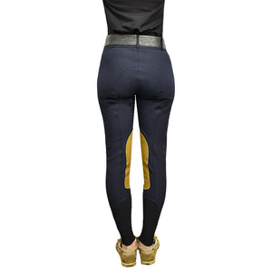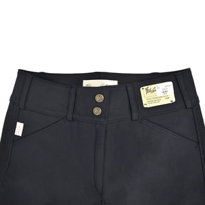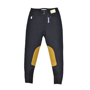 The new fabric allows for a form-fitting figure-flattering look while maintaining its shape and moving with you while riding.  These breeches are made from a lightweight, woven 73% cotton/20% polyamide /7% Lycra, with a four-way stretch for comfort.  Classic European leg seams on the outside of the breech. Vintage clarino knee patches, front zip, front slash pockets, belt loops, Velcro brand ankle closures.