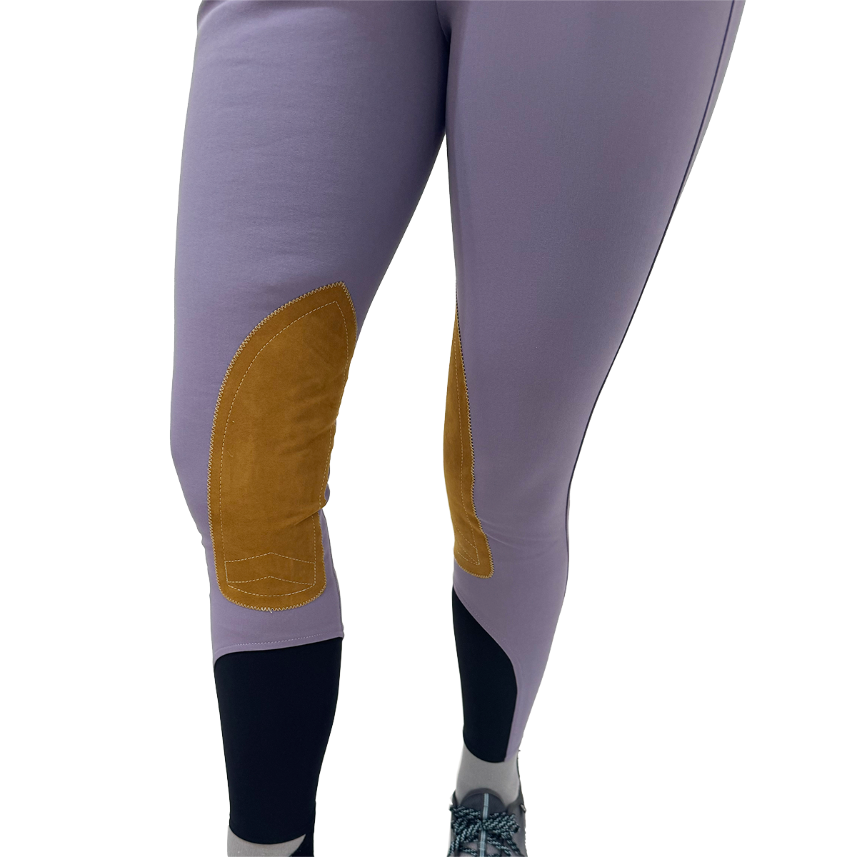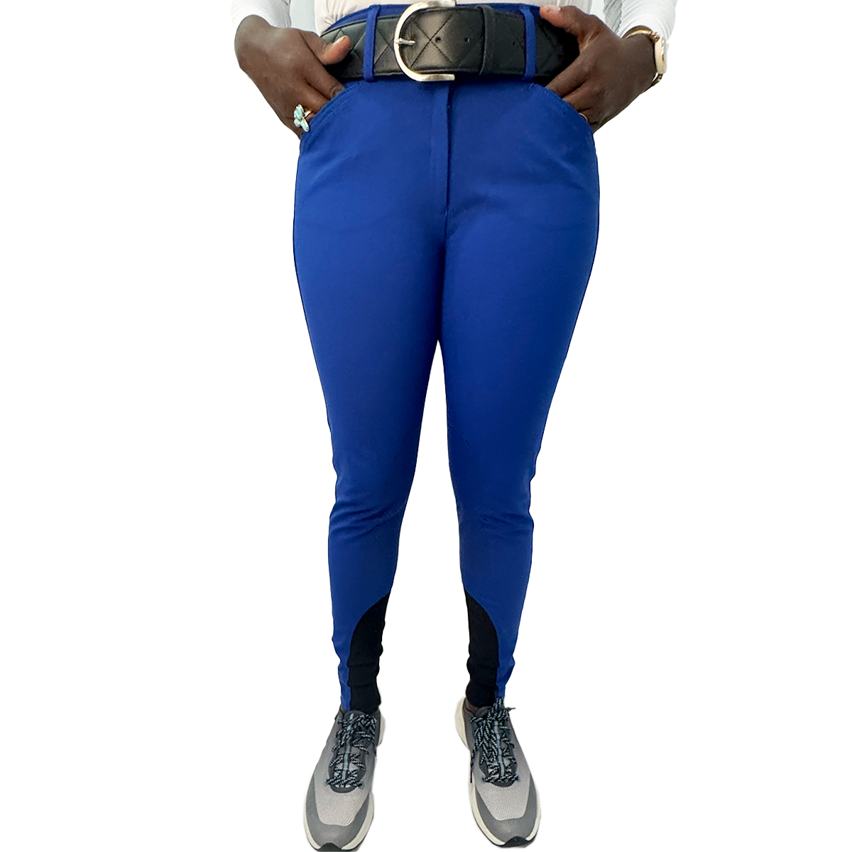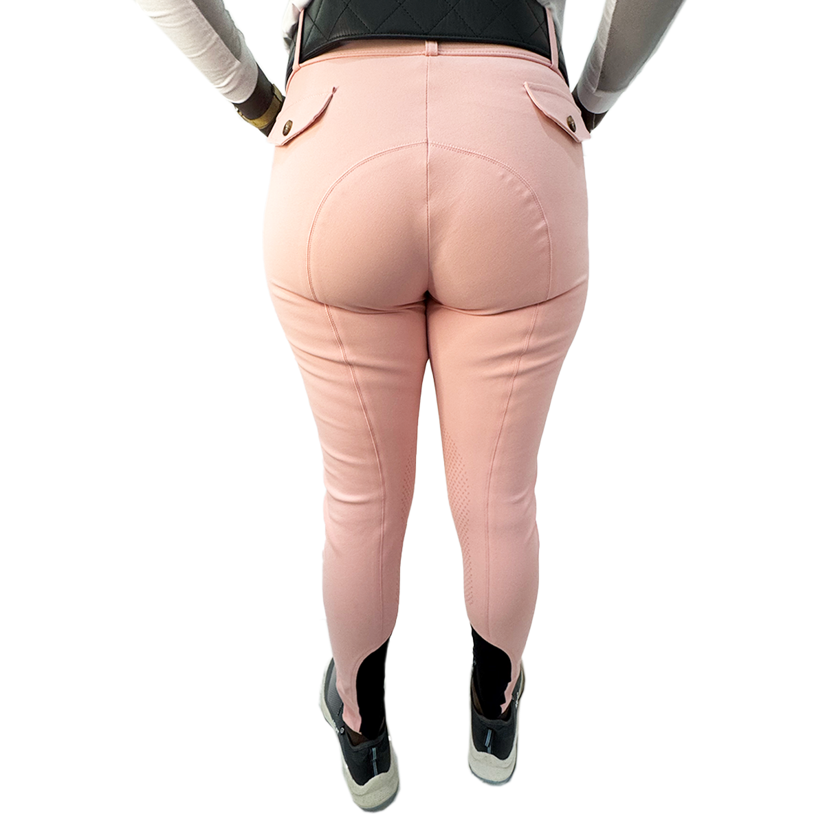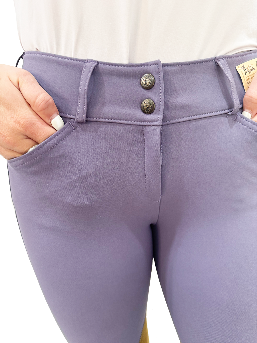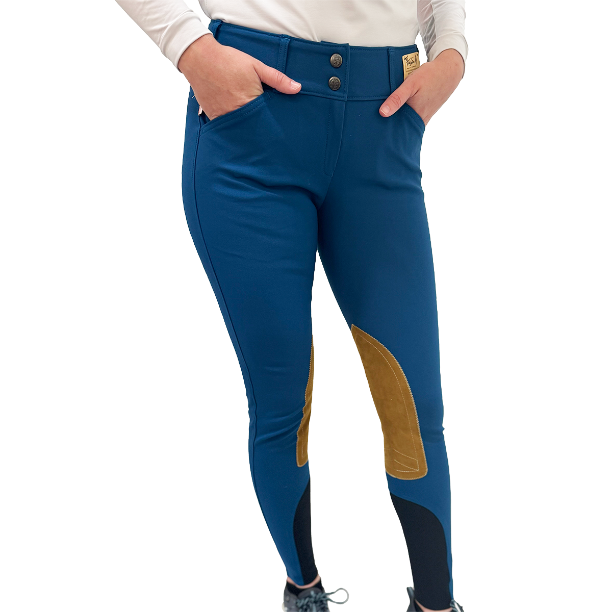 The new fabric allows for a form-fitting figure-flattering look while maintaining its shape and moving with you while riding.  Lightweight, woven 73% cotton/20% polyamide /7% Lycra, with four-way stretch for comfort.  Classic European leg seams on the outside of the breech. Vintage clarino knee patches, front zip, front slash pockets, belt loops, Velcro brand ankle closures.  Proudly made in the USA.