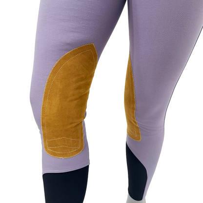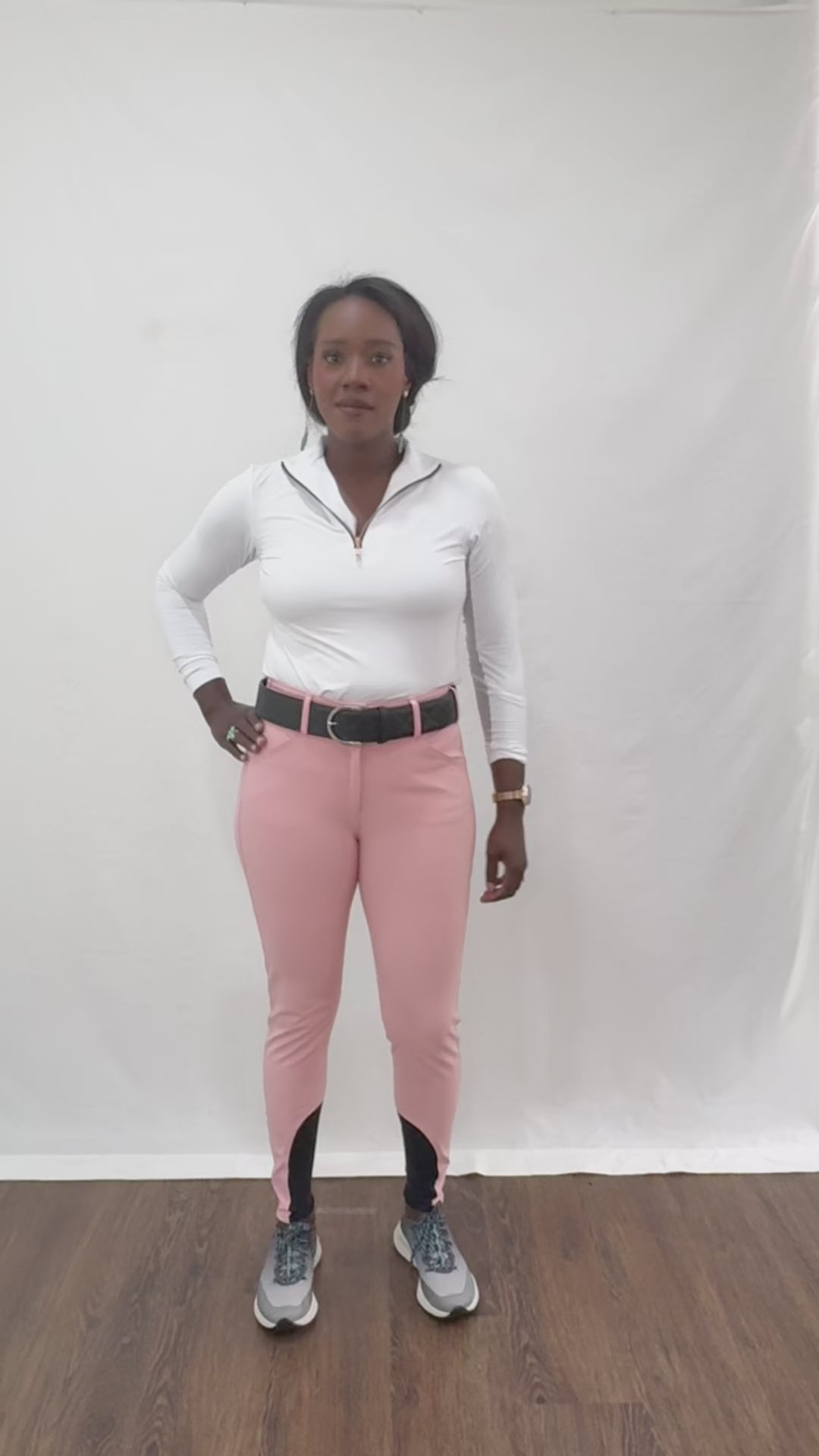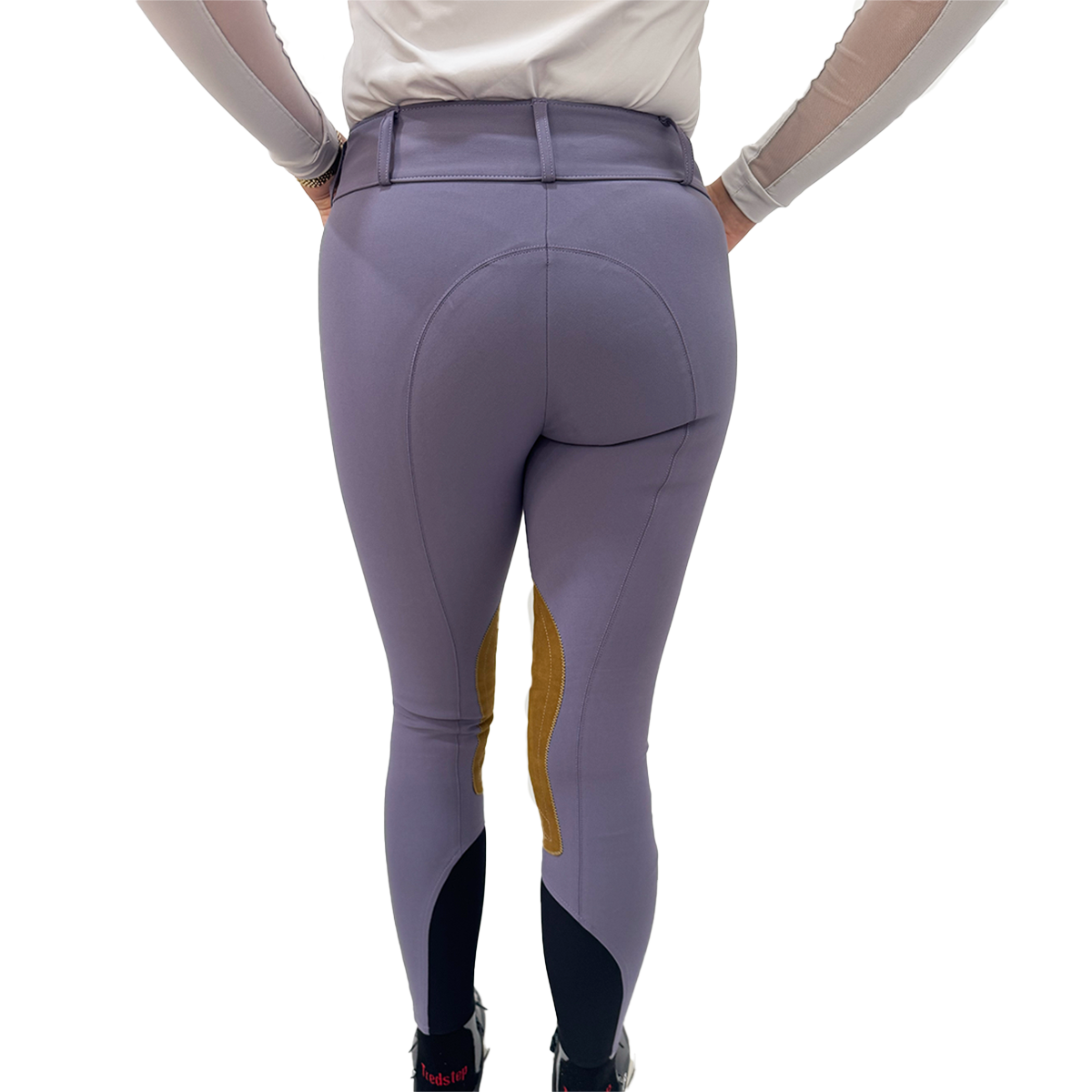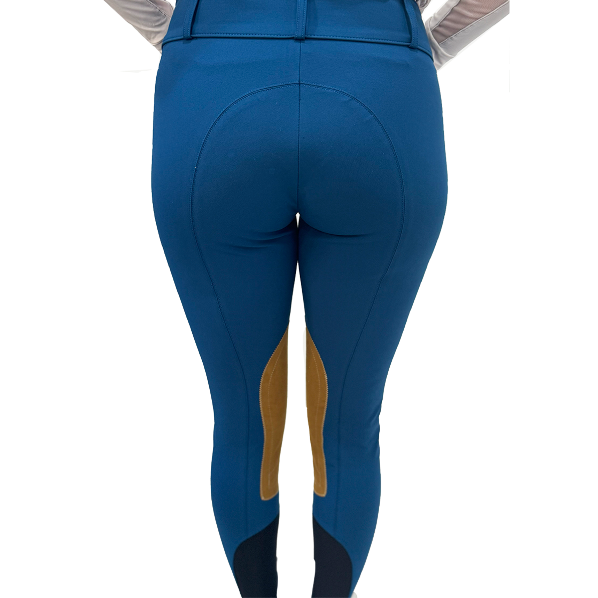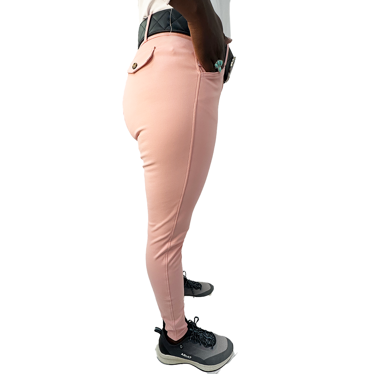 The new fabric allows for a form-fitting figure-flattering look while maintaining its shape and moving with you while riding.  Lightweight, woven 73% cotton/20% polyamide /7% Lycra, with four-way stretch for comfort.  Classic European leg seams on the outside of the breech. Vintage clarino knee patches, front zip, front slash pockets, belt loops, Velcro brand ankle closures.  Proudly made in the USA.