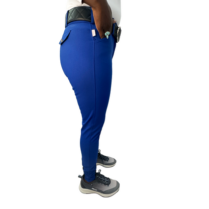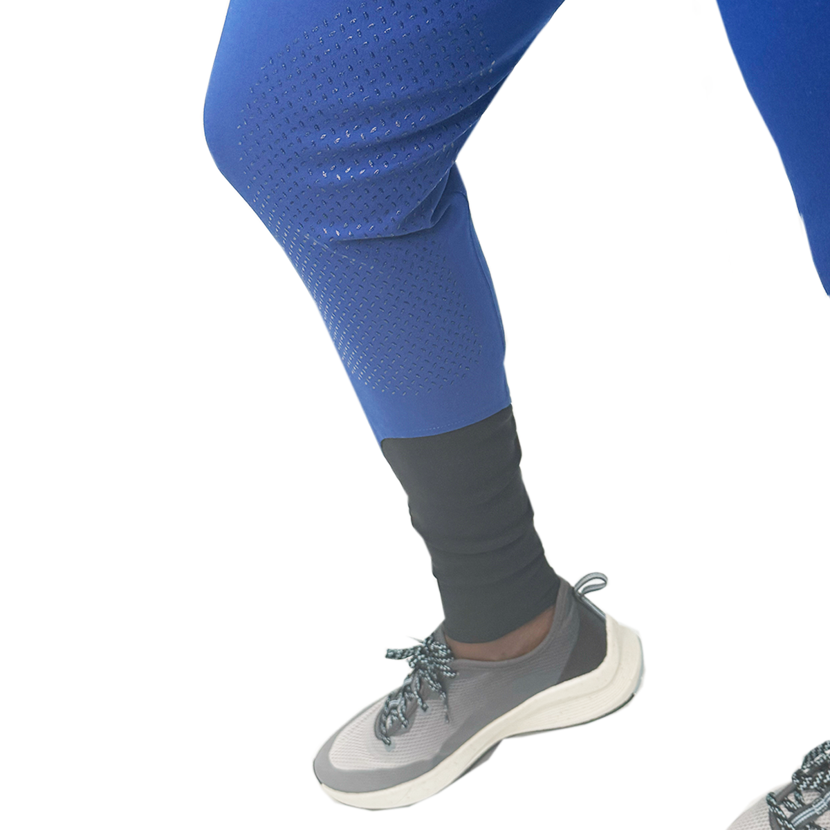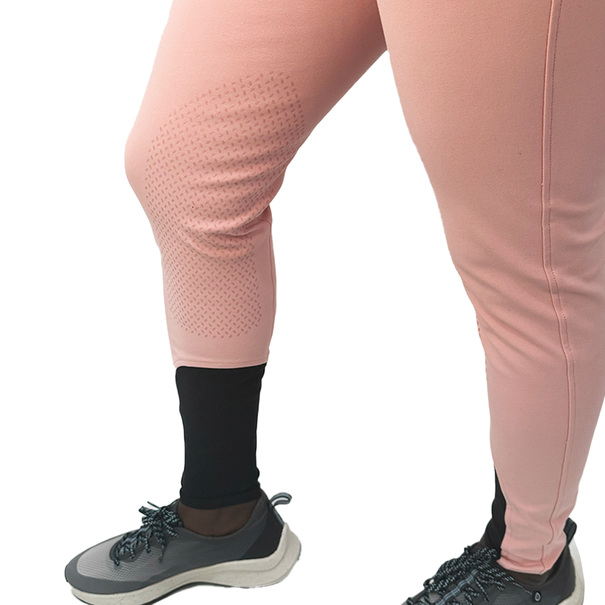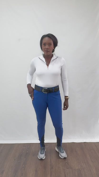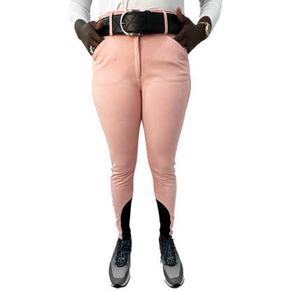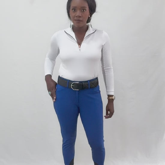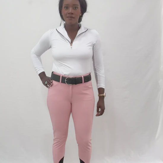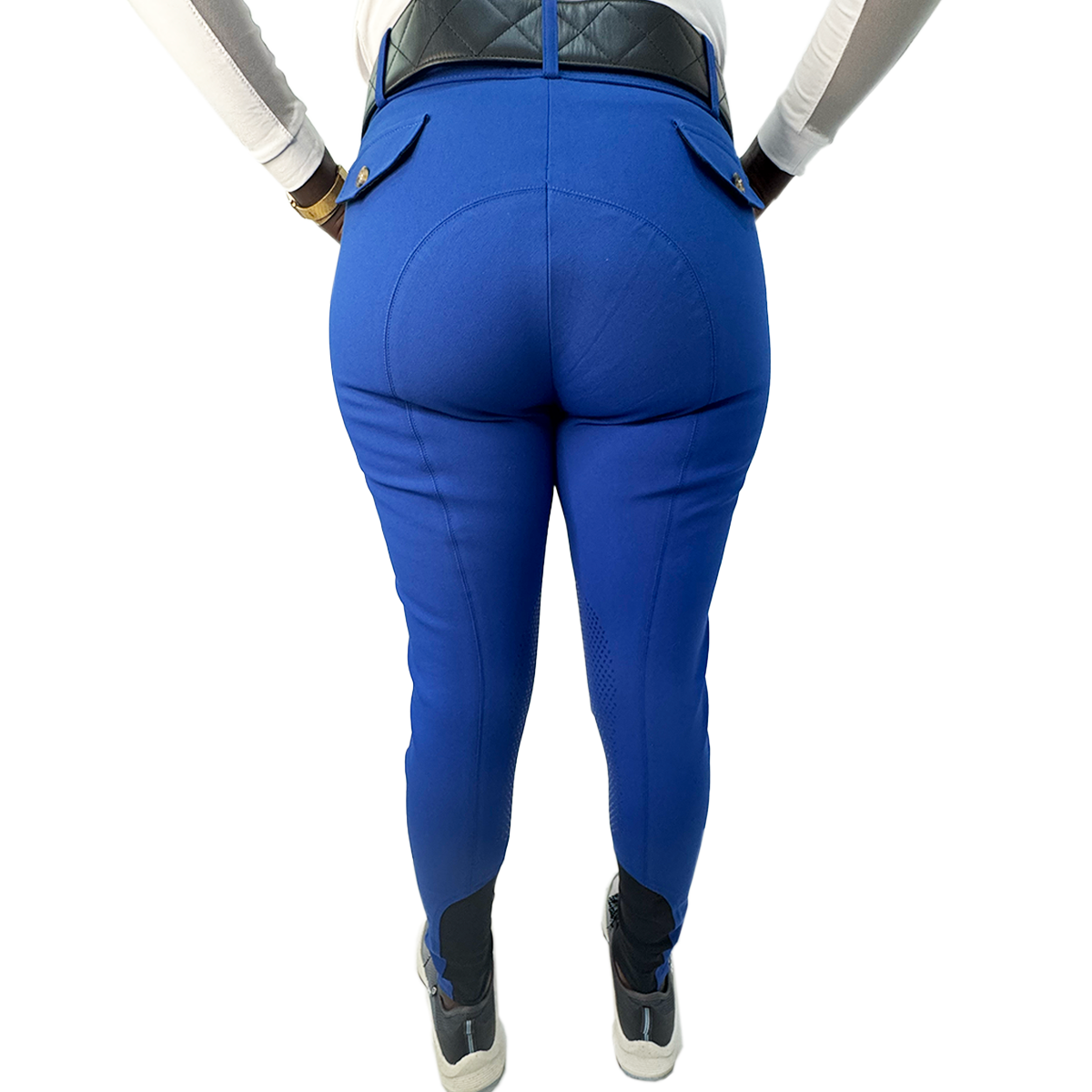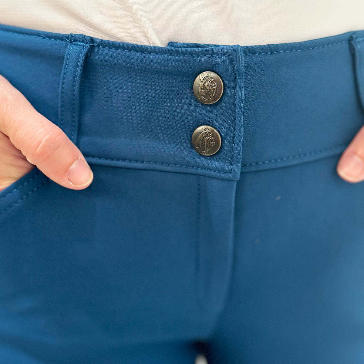 The new fabric allows for a form-fitting figure-flattering look while maintaining its shape and moving with you while riding.  Lightweight, woven 73% cotton/20% polyamide /7% Lycra, with four-way stretch for comfort.  Classic European leg seams on the outside of the breech. Vintage clarino knee patches, front zip, front slash pockets, belt loops, Velcro brand ankle closures.  Proudly made in the USA.