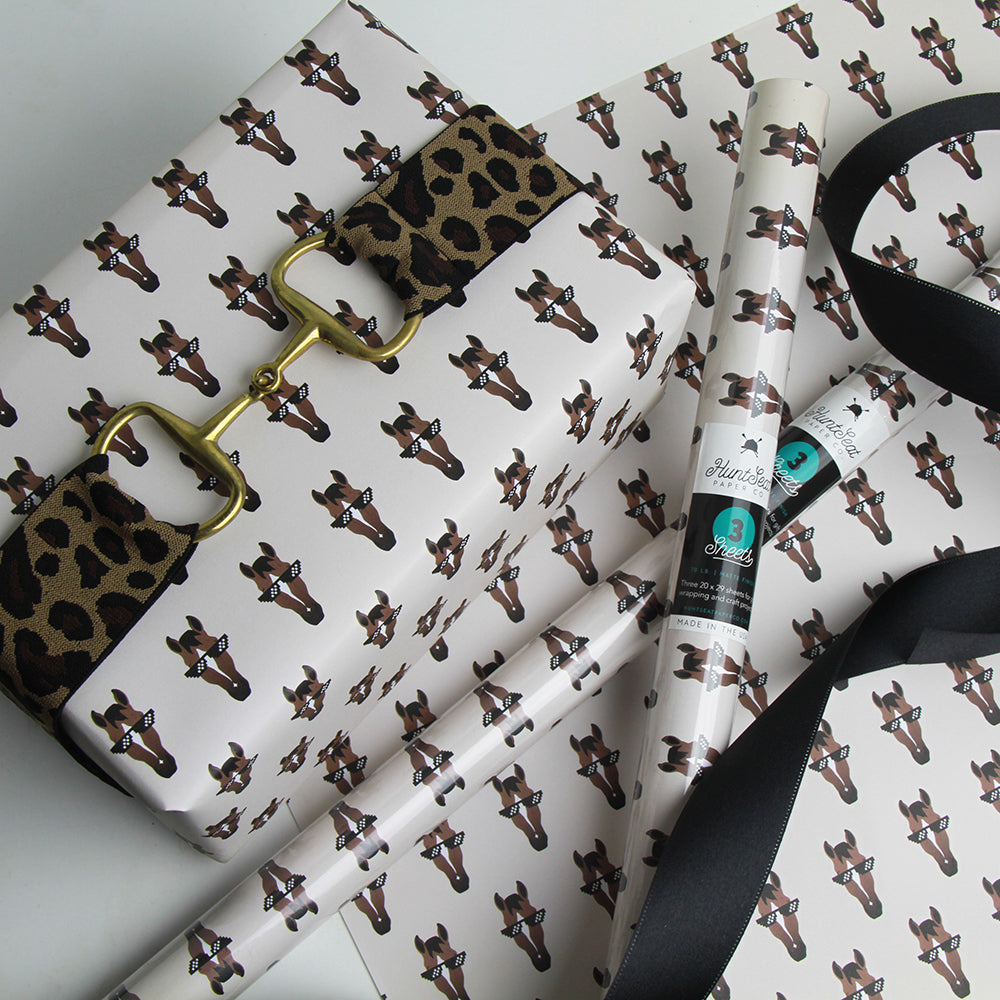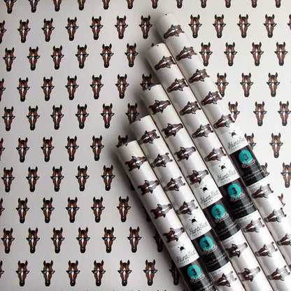 Three 20 x 29 inch sheets of 70lb gift wrapping and craft paper, rolled in a cellophane tube with branded sticker.