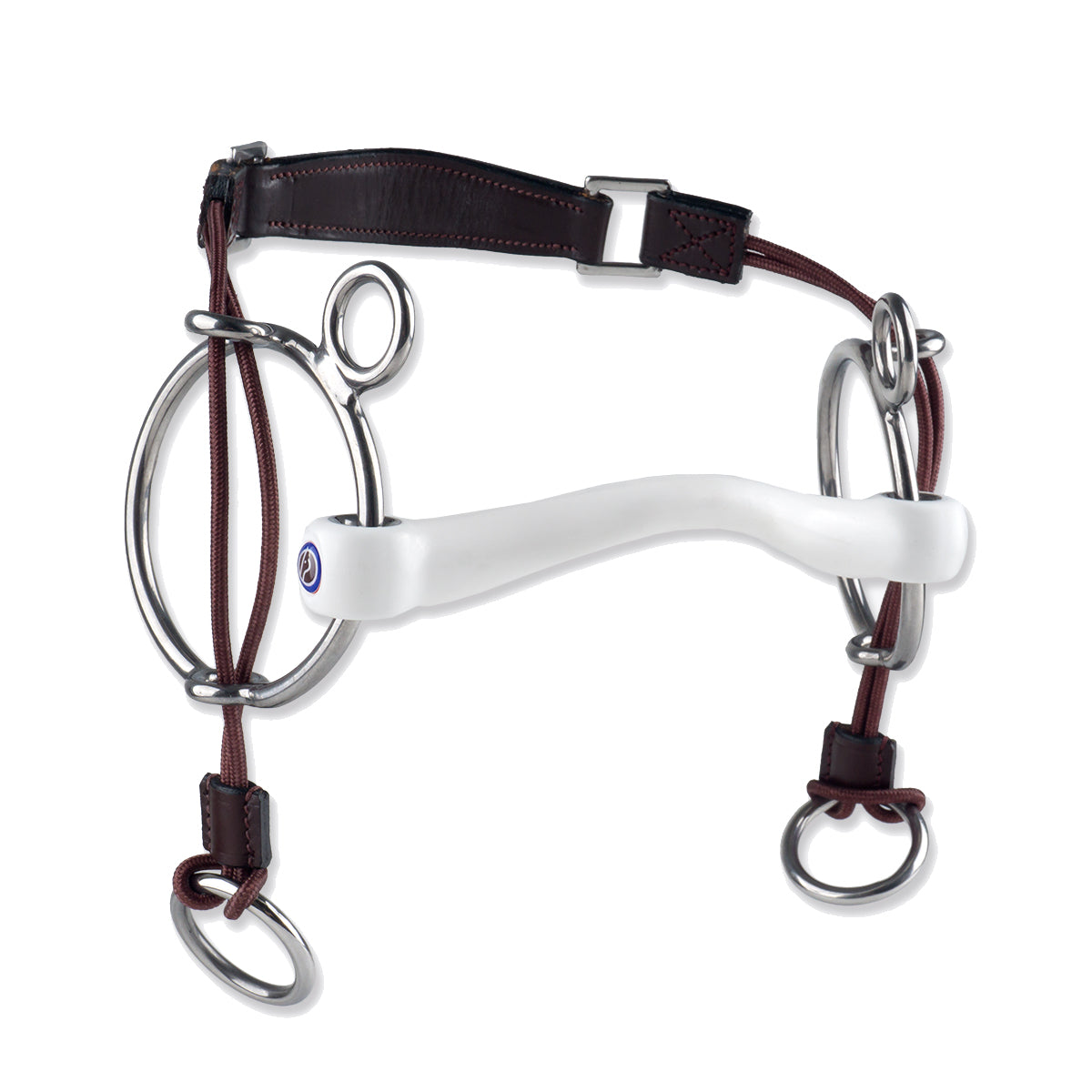A curb gag is similar to a gag but has a different effect. The pressure will now not be behind the ears but on the lower jaw/chin. The cord runs under the chin and the cheekpieces are attached to the extra ring at the top. This bit is effective for strong, hot horses and is mainly used by show jumping riders. This bit is not suitable for inexperienced riders.