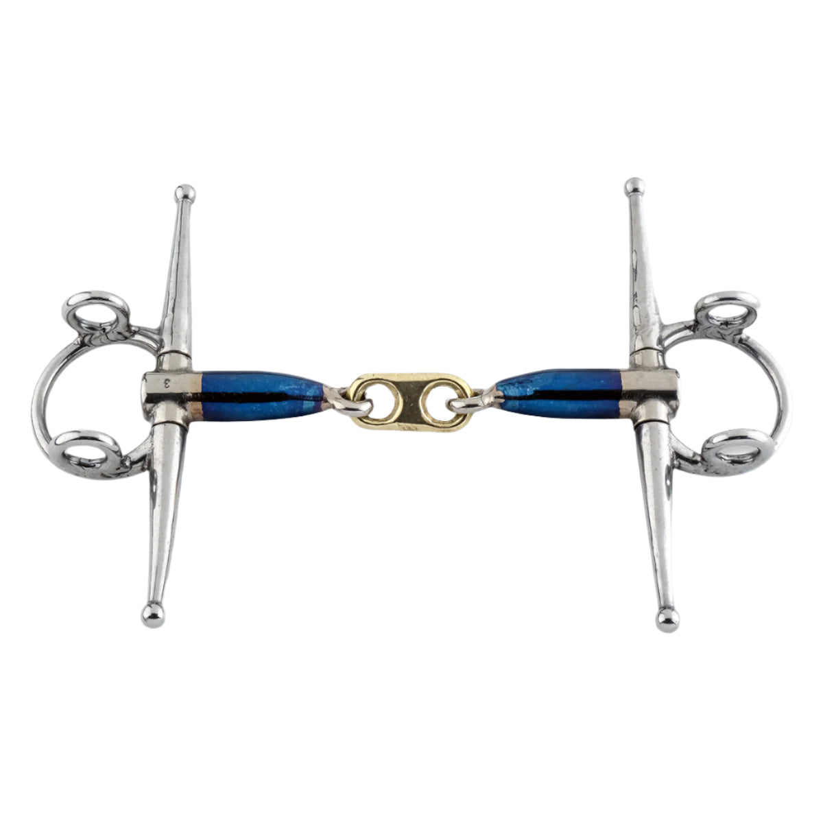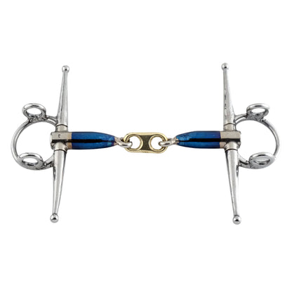 The Dr. Bristol mouthpiece is a double-jointed mouthpiece with a flat insert. During relaxation, this insert lies flat on the tongue and exerts light pressure. When the horse hits the bit with the tongue and threatens to take over control, the intermediate piece tilts, causing the bit to have a sharp effect on the tongue. This bit is not suitable for inexperienced riders.The Sweet Iron bits are made of steel and have a recognizable blue color. Sweet Iron develops surface rust through contact with (air) moisture that tastes sweet and stimulates the horse's saliva production naturally. This will cause the horse to foam more, which ensures better acceptance of the bit. This rusting process (oxidation) changes the blue color of the TRUST bits to brown-gray.