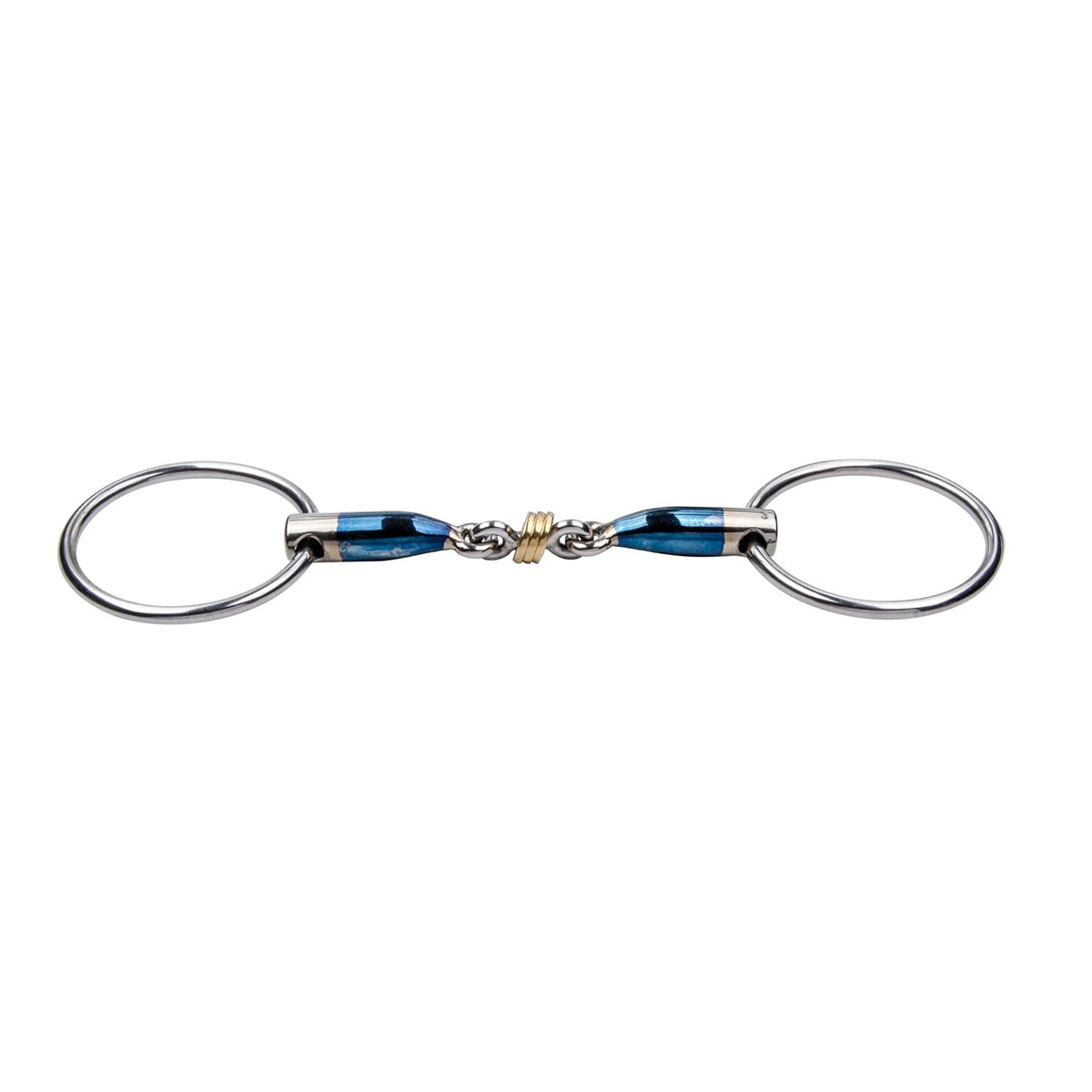 The continuous rings on Trust Sweet Iron Loose Ring With Brass Rings function by transferring tension through the reins to the lower jaw through the tongue. It should be noted that pressure on the neck is not caused by the bit itself, but rather by the noseband.