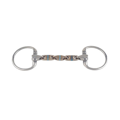 The Trust Waterford olive head bit is a standard side bit combined with the special Waterford mouthpiece. The mouthpiece consists of several free-moving, rounded links, which do not allow the horse to lie on the bit. The recognizable blue color is the so-called Sweet Iron coating. This coating oxidizes on contact with moisture and forms surface corrosion. This corrosion tastes sweet to horses and they accept the bit better and are more likely to start foaming and chewing. With the olive head side piece, the rings cannot move independently of each other, so the bit lies particularly quietly and stably in the horse's mouth. In addition, pinching of the sensitive corners of the mouth is not possible with the correct position. The rider's aids are conveyed directly with this combination of olive head and Waterford. With the Waterford mouthpiece, it should be noted that it can act very sharply with a strong hand.