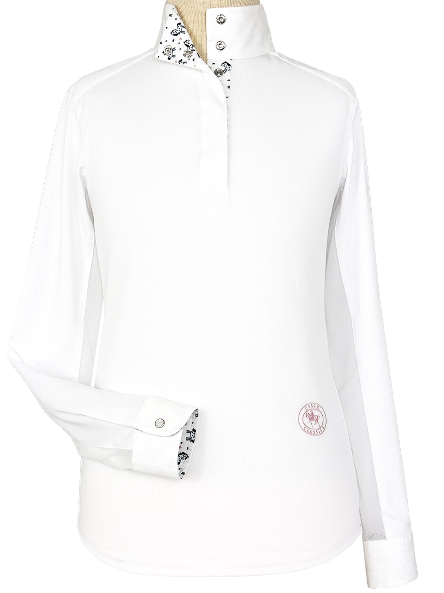Our Talent Yarn® Show Shirt is the classic choice for looking crisp and polished in the show ring. Expertly tailored in easy pullover style with a gently tapered body fit for a neat appearance with or without your show coat. Unsnap the collar and turn back the cuffs to show our exclusive fabric trim. Smart, thermoregulating technology helps maintain an optimal body temperature. Moisture wicking and deodorizing antimicrobial properties provide quick dry and stay fresh benefits that never wash out. Stain resistance helps keep your shirt looking new wash after wash. Breathable, stretch Talent Yarn keeps you comfortable in the saddle even on the longest days.