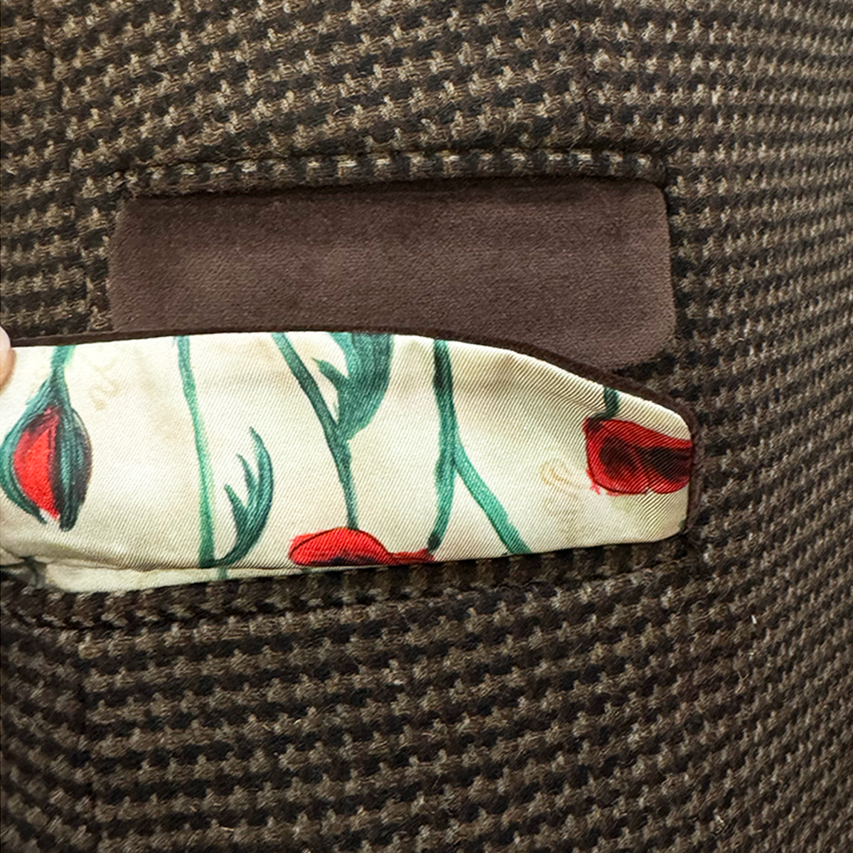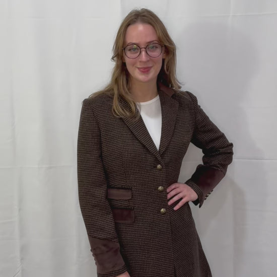 This classic, long-lined women's coat features a traditional v-neck and contrast velvet detailing on the collar and pockets. The unique signature cuff adds depth to the design, while muted antique bronze buttons and an embroidered lion emblem elevate the overall look.