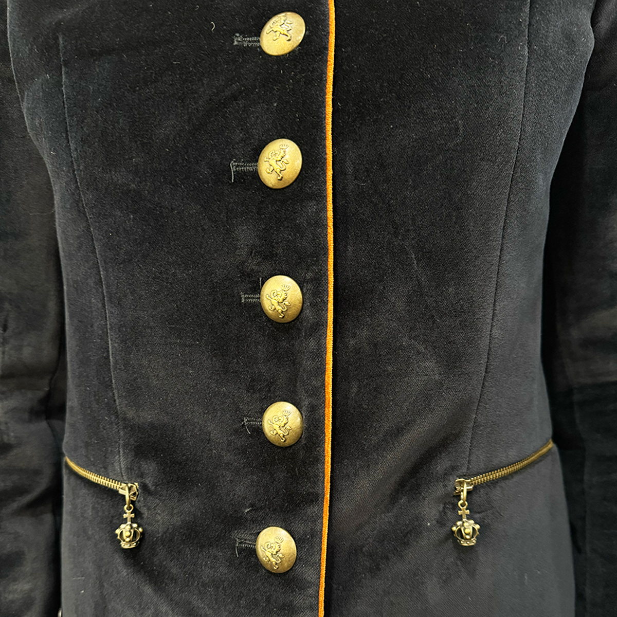 This coat is a tailored dream. The tan piping detailing and muted brass buttons contrast beautifully with the navy velvet, and the inside cuffs reveal exquisite pops of color. The zipped pockets with crown charms are playful and the mid-length style is refined.