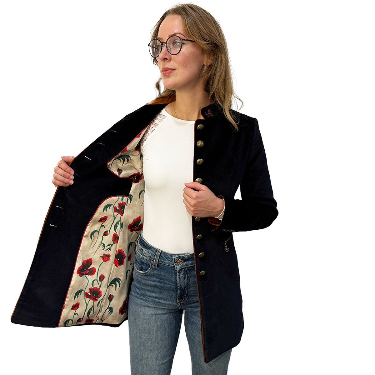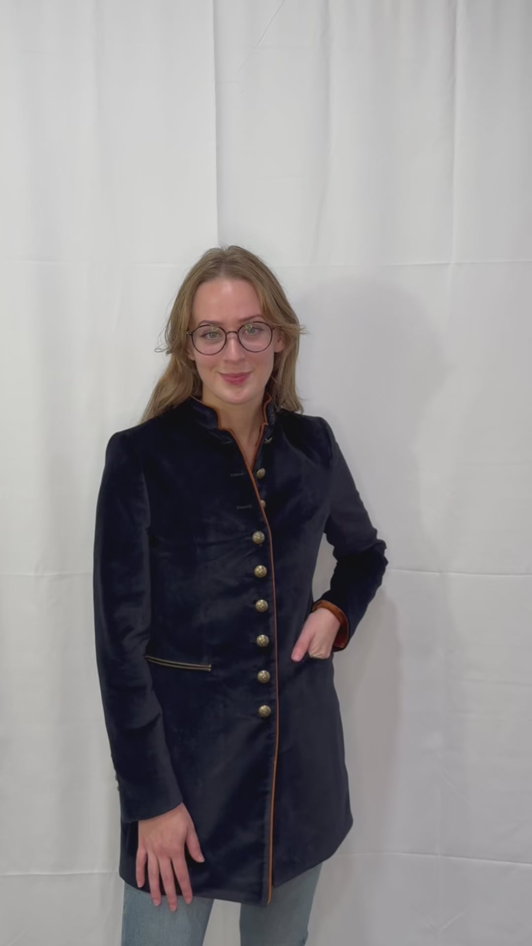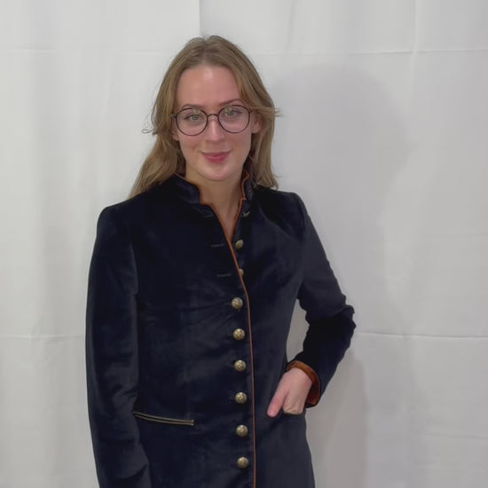 With tan-colored fabric lining the inside cuffs of the coat, it creates a striking contrast against the navy velvet exterior. It adds a unique and eye-catching element to the design.