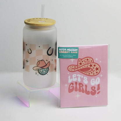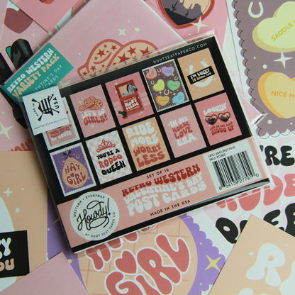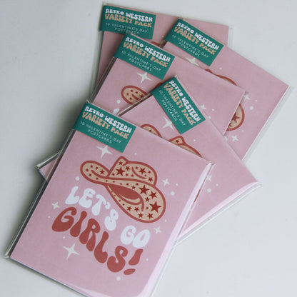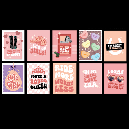 10 Valentine's Day Postcards with retro-inspired cowgirl designs. Sayings include "Let's Go Girls!" "I'm in my horse lover era" "Ride more, worry less" "Lookin' like ya got some giddyup" and more.