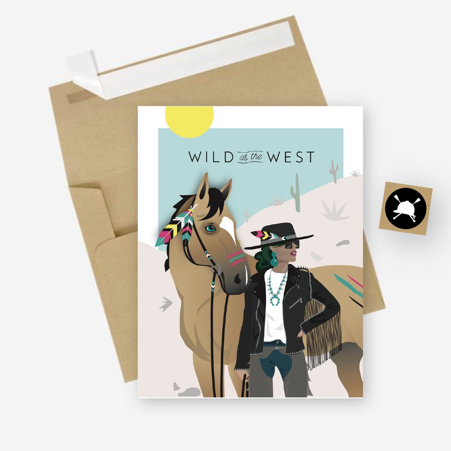 Part of our Howdy! Western + Everyday Collection. Boho, outlaw cowgirl with buckskin horse.